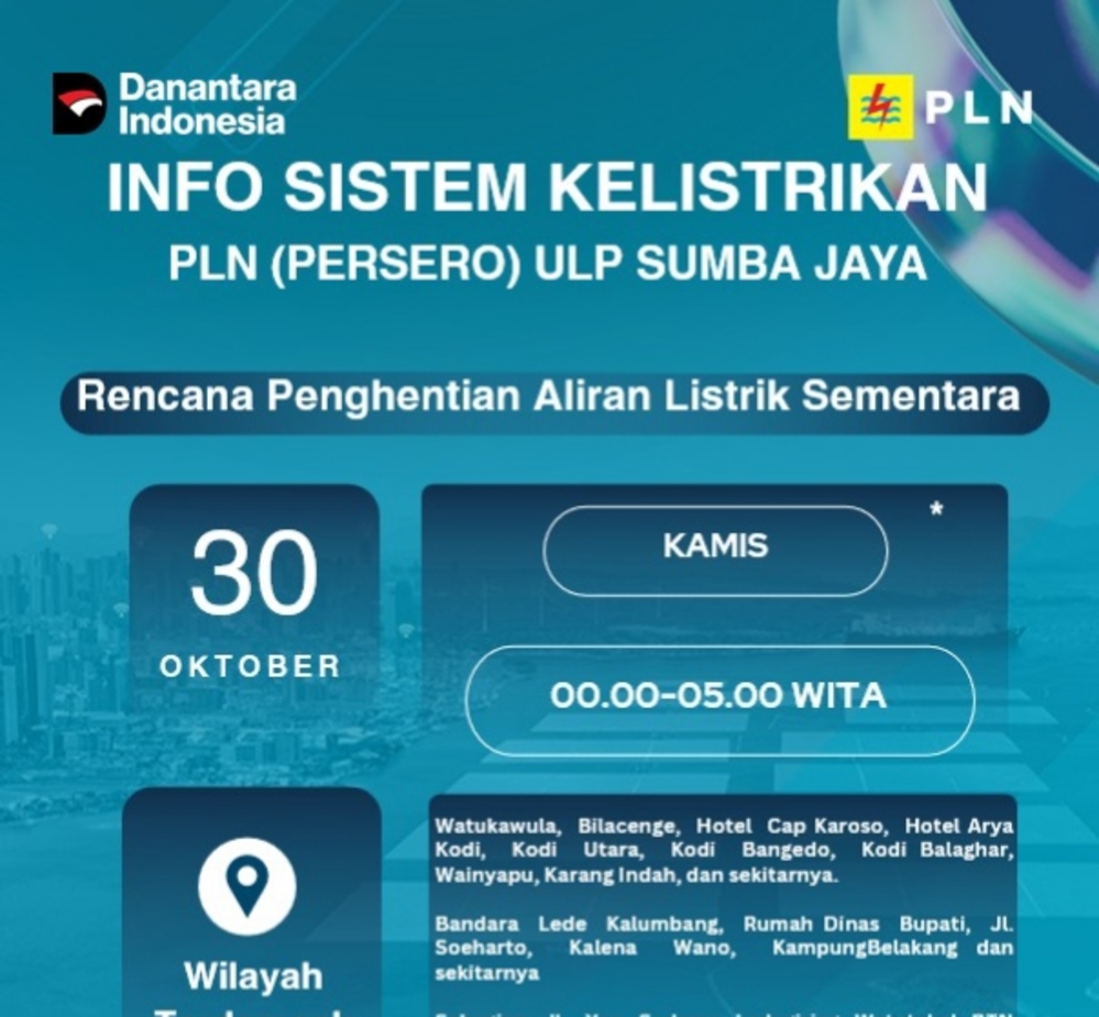 Kabar pemadaman listrik tersebut disampaikan PT PLN ULP Sumba Jaya dalam flyer yang disebarluaskan di media sosial.