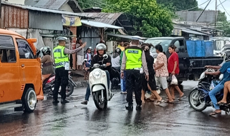 Dua anggota kepolisian dari Satuan Lalu Lintas yakni Aipda Usman Sina dan Brigpol Aman, berdiri mengatur arus lalu lintas di sekitar pasar yang dipadati kendaraan dan pejalan kaki. Hujan mengguyur tanpa jeda, seragam mereka basah, namun perhatian mereka tak pernah lepas dari setiap pergerakan di jalan.