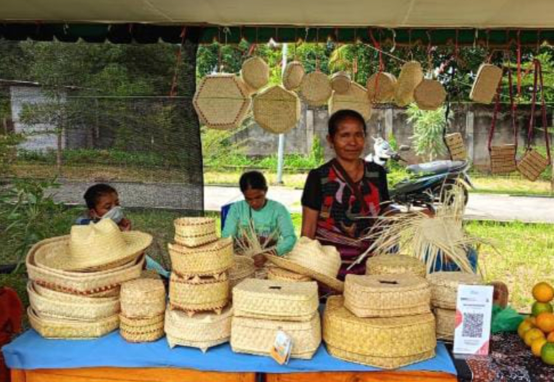Yohana, yang kini aktif sebagai pengrajin anyaman daun lontar, tampil sederhana namun penuh percaya diri di stan nomor 3. Ia menganyam sambil melayani pengunjung yang tertarik pada produk-produk kerajinannya.
