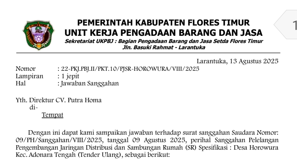 NTTKreatif.com, Larantuka – Polemik tender ulang proyek Pengembangan Jaringan Distribusi dan Sambungan Rumah (SR) di Desa Horowura, Kecamatan Adonara Tengah, Kabupaten Flores Timur, kembali memanas. CV Putra Homa, yang sebelumnya menjadi penawar terendah, menggugat keputusan kelompok kerja (Pokja) pemilihan yang menggugurkan mereka. Namun, sanggahan tersebut resmi ditolak Pokja.
