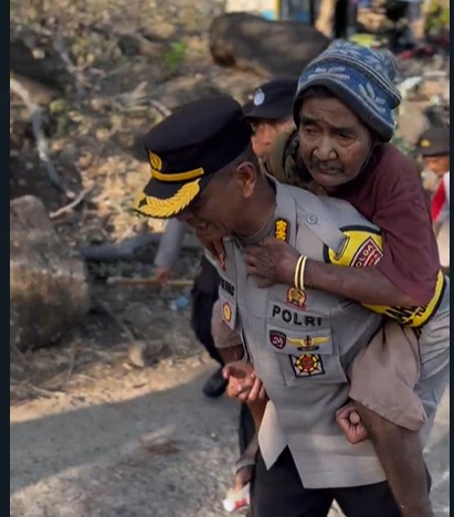 Momen Haru Tercipta di Tengah Erupsi, Karo Ops Polda NTT Panggul Lansia di Kawasan Gunung Lewotobi